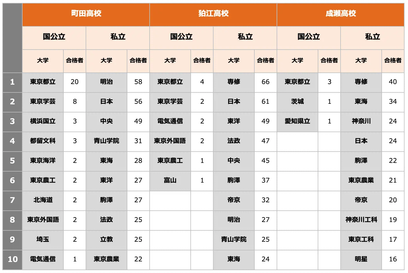 高校選びで重要な要素の1つである「進学実績」。 町田高校、狛江高校、成瀬高校の進学実績は色々なサイトにまとめられていますが、「どこの大学に合格する人が多いの?」と思っても、なかなかランキング形式でまと