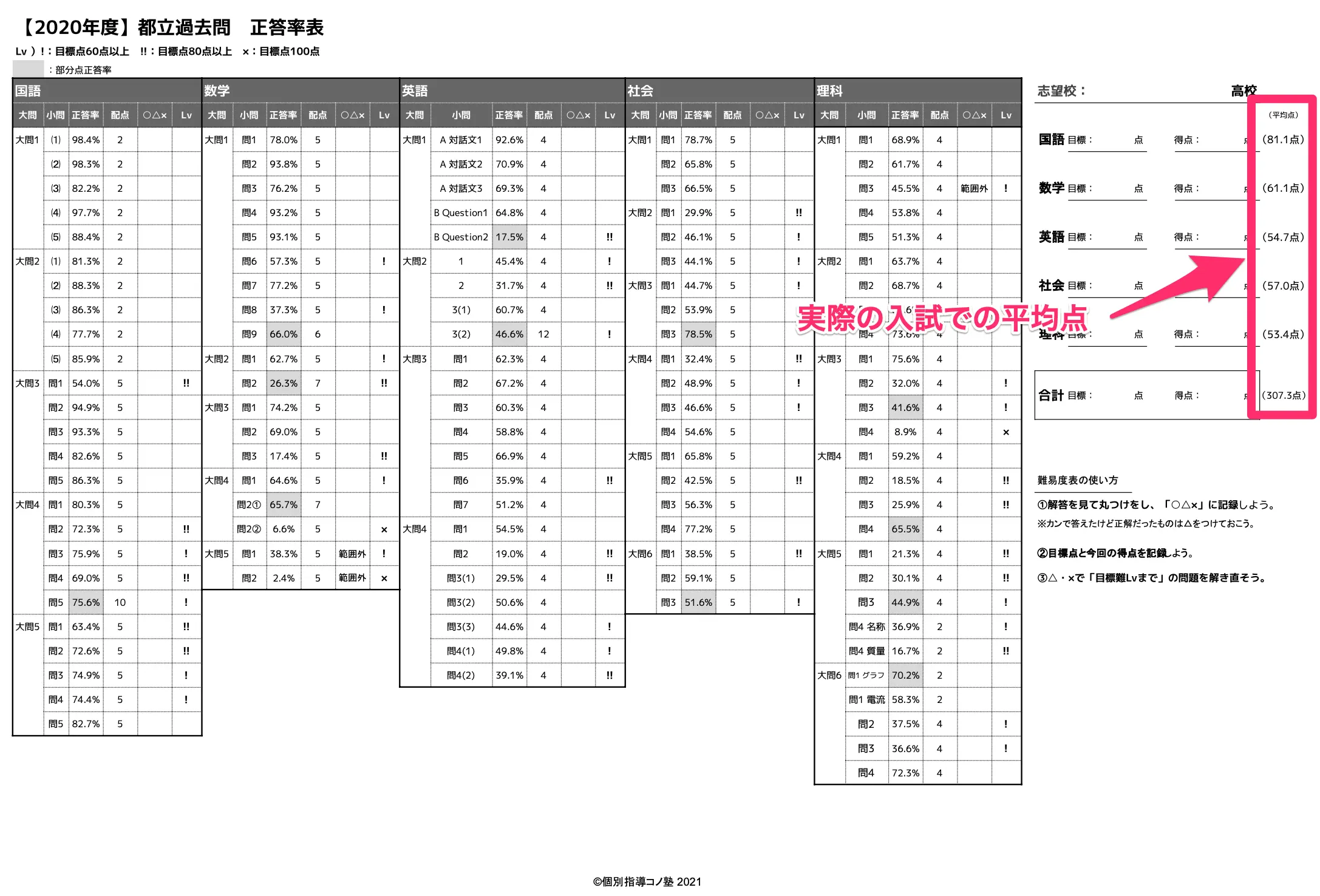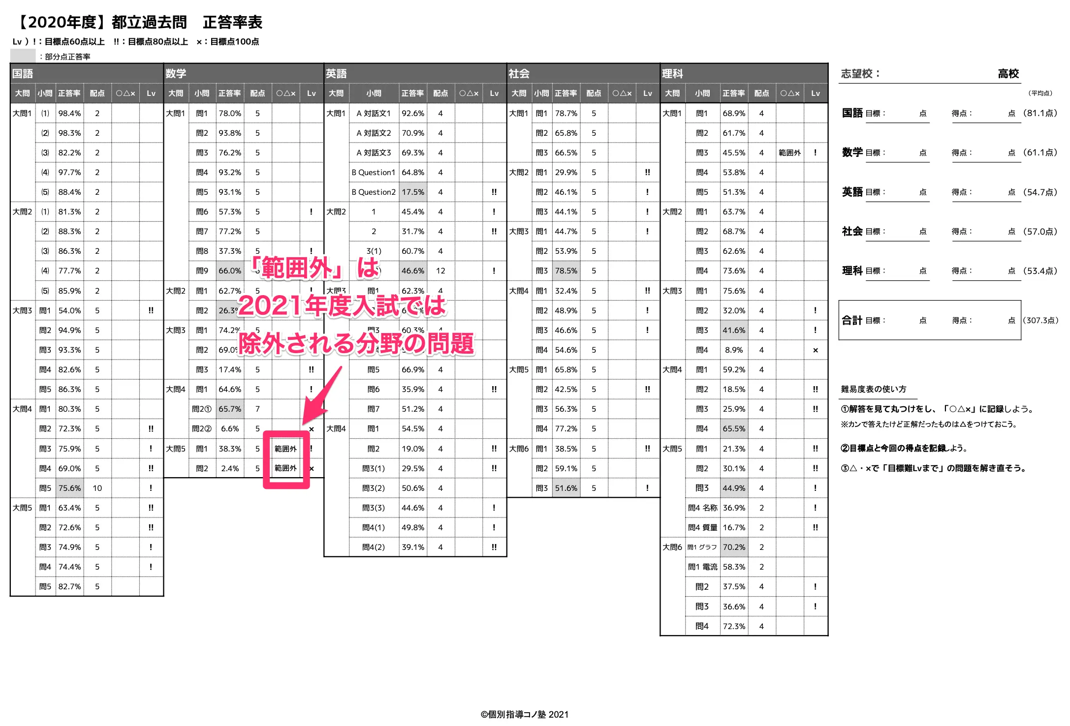 範囲外だけでなく、正答率・難易度・平均点も記載してます