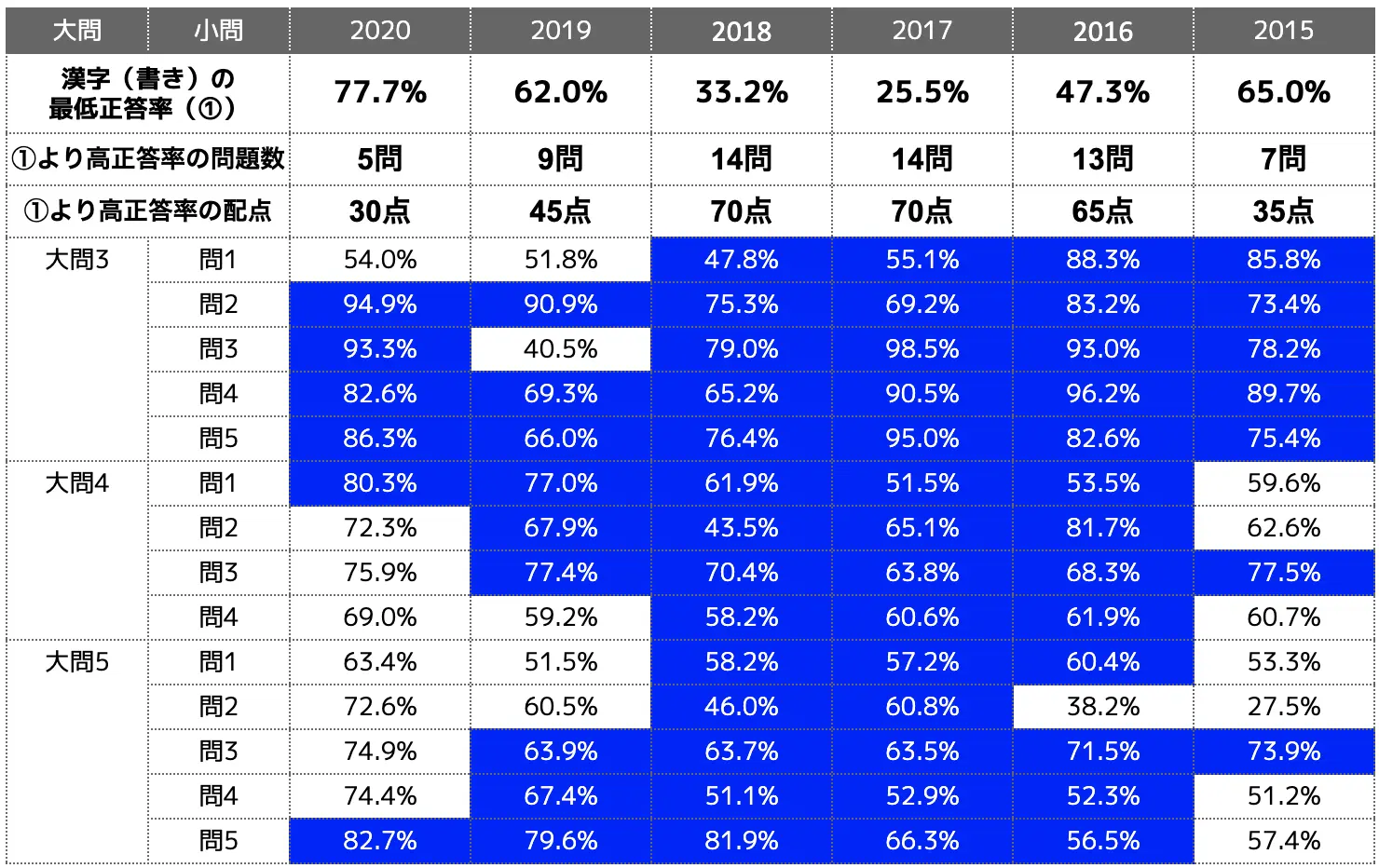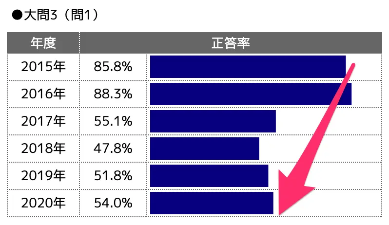 直近3年間(2018・2019・2020年度)の正答率でいえば、1.6%しか変わりませんでした。