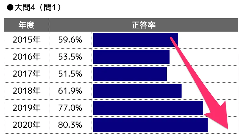 逆に大問4の問1は、2017年度は正答率が50%程度でしたが、2020年には80%以上まで上がっています。