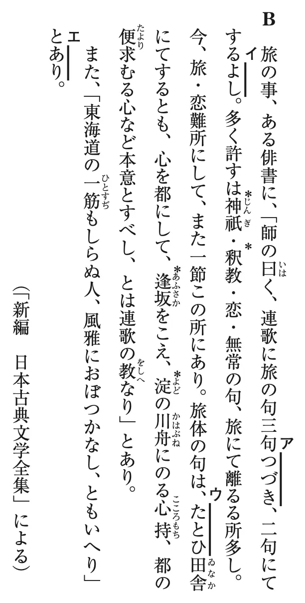 Bの中のーを付けたア〜エのうち、現代仮名遣いで書いた場合と異なる書き表し方を含んでいるものを一つ選び、記号で答えよ。