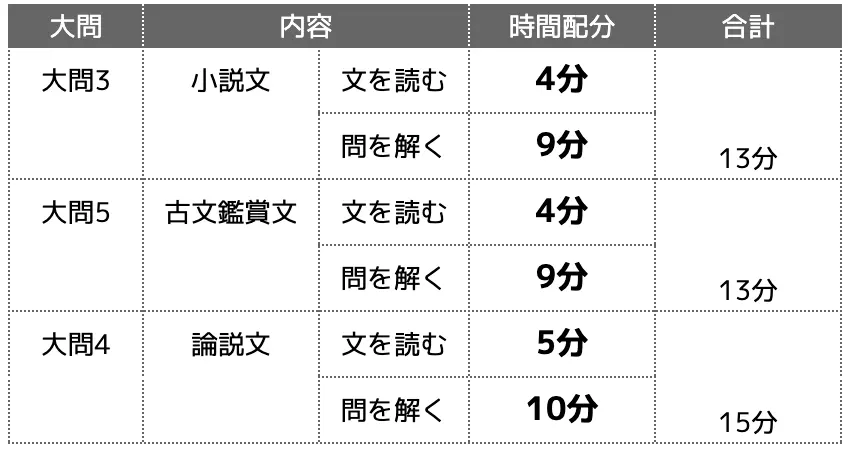 さらに「文章を読む時間」と「問題を解く時間」にわけると、時間の目安は以下のようになります。