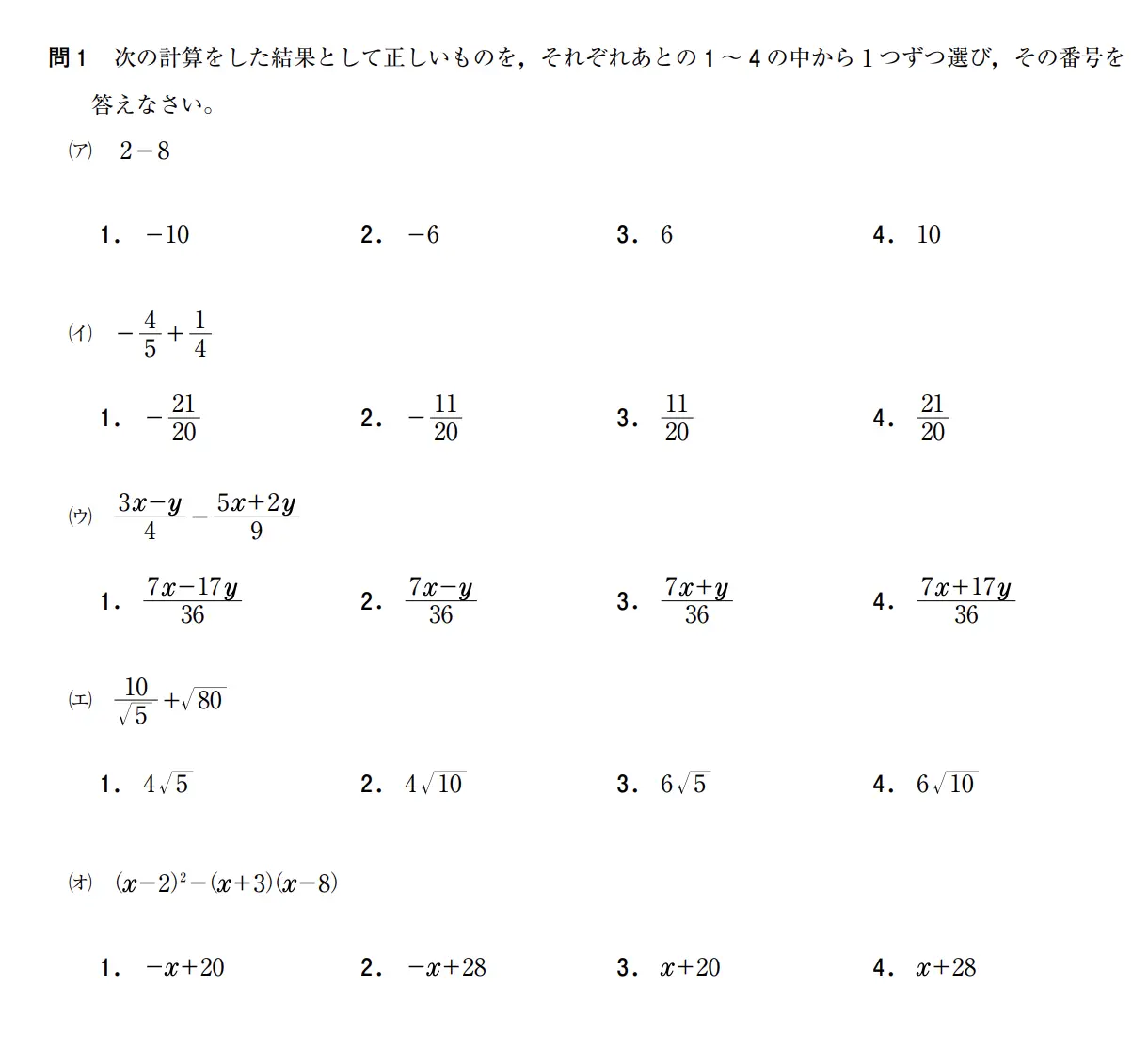 大問1では、以下のような問題が出題されます。令和6年度の入試問題を参考にしてください。