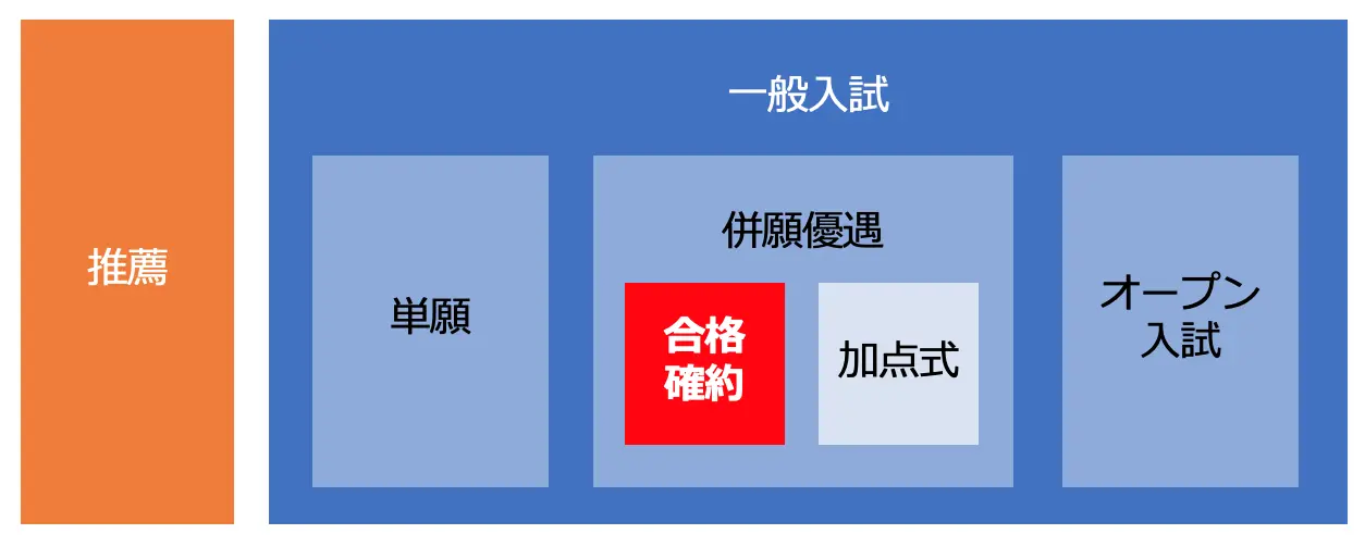 合格確約式 :高校の求めている内申点などの基準を満たせば、学力検査を受けなくても(または学力検査は受けるが、そこまでの点数が取れなくても)ほぼ事前に合格が確約される →大きな問題がなければ、ほぼ確実に滑り止めとして合格できる