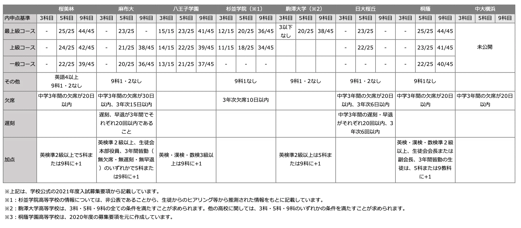 今回比較している高校では、内申点に関しては3科目・5科目・9科目のうちいずれかの条件、その他(遅刻・欠席など)については、すべての条件を満たす必要があります(駒澤大学高等学校だけは、3科・5科・9科のすべての条件を満たすことが求められます)。