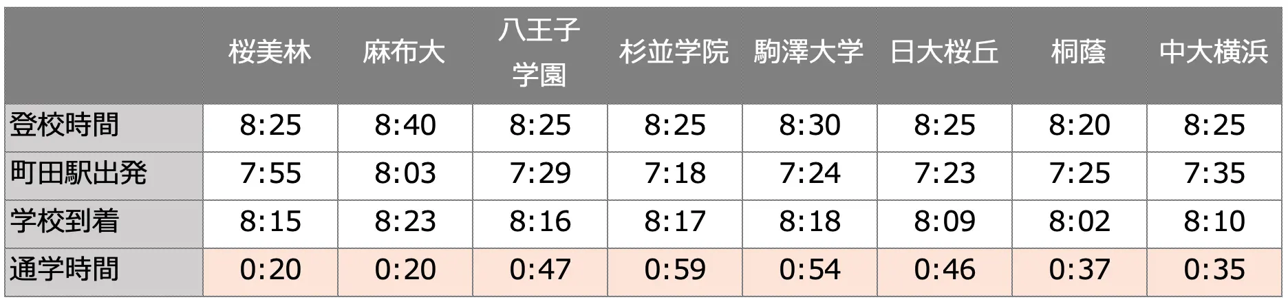 以下の表に、各校の登校時間に間に合うために町田駅を出発する時間とその通学時間をまとめてみました。