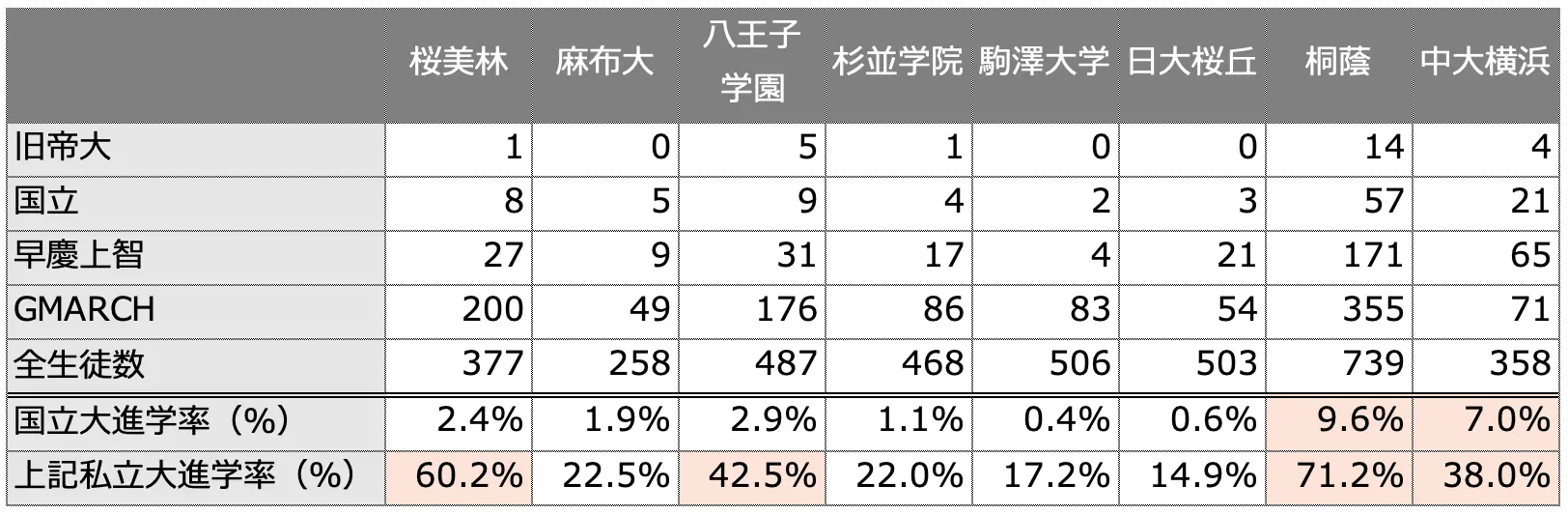 高校の授業や進路指導の状況などを分析する上でも、国立大学の進学率、難関私立大学(早慶上智・GMARCH)への進学率は重要な情報と言えるでしょう。