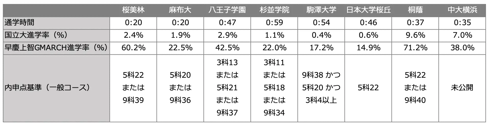 通学時間、進学率、内申点基準(一般コース進学)のまとめ】