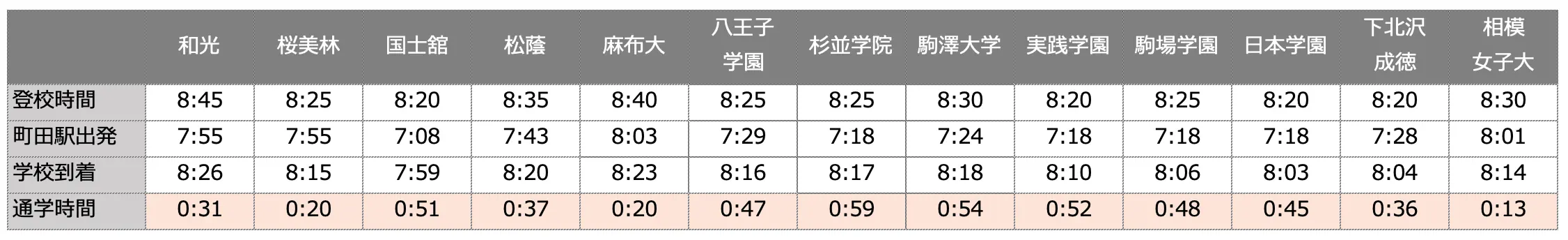 以下の表に、各校の登校時間に間に合うために町田駅を出発する時間とその通学時間をまとめてみました。