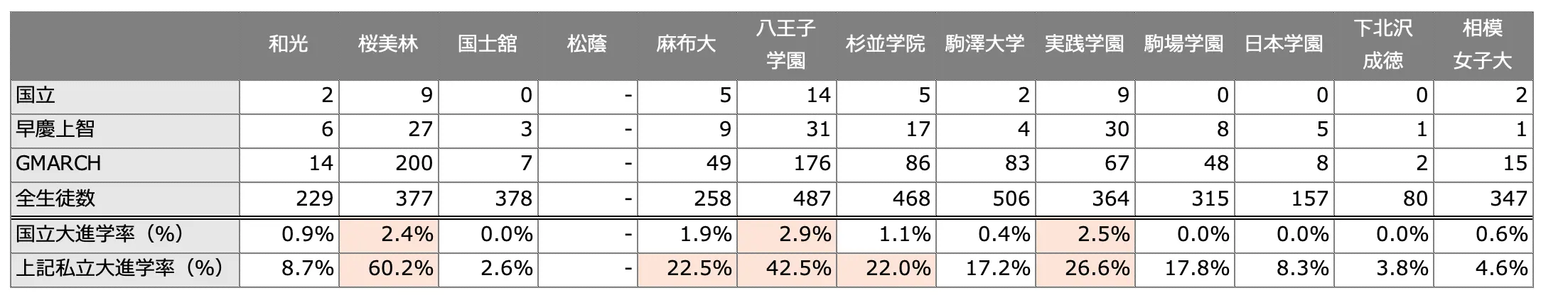 高校の授業や進路指導の状況などを分析する上でも、国立大学の進学率、難関私立大学(早慶上智・GMARCH)への進学率は重要な情報と言えるでしょう。