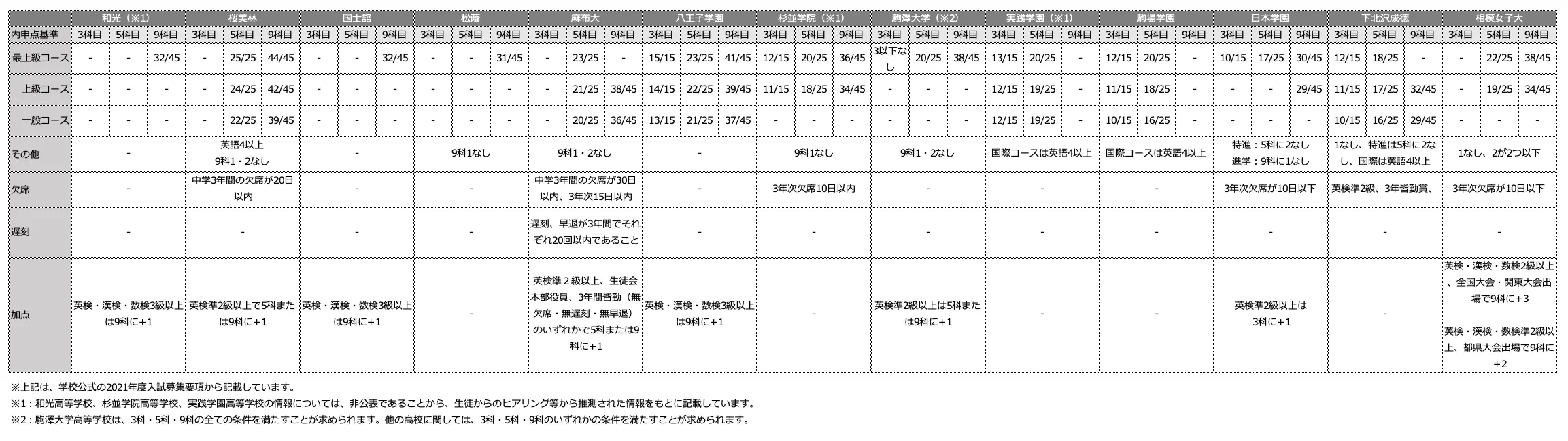 今回比較している高校では、内申点に関しては3科目・5科目・9科目のうちいずれかの条件、その他(遅刻・欠席など)については、すべての条件を満たす必要があります(駒澤大学高等学校だけは、3科・5科・9科のすべての条件を満たすことが求められます)。