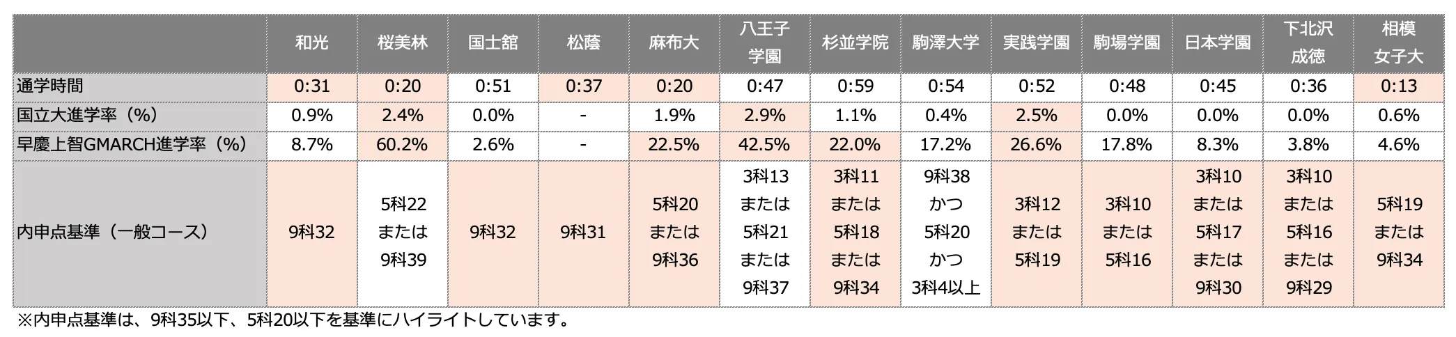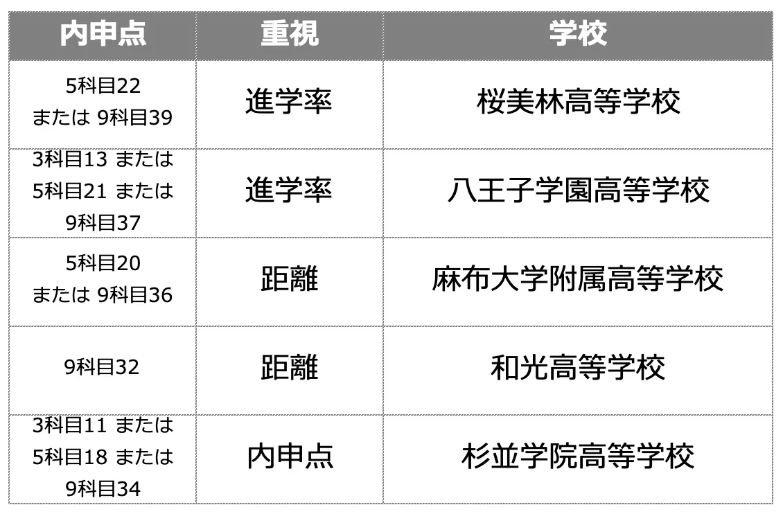- 内申点が5科目20程度: 通学時間は町田から50分程度かかるが、国立大+早慶上智GMARCH進学者を約5割も出している八王子学園高等学校
