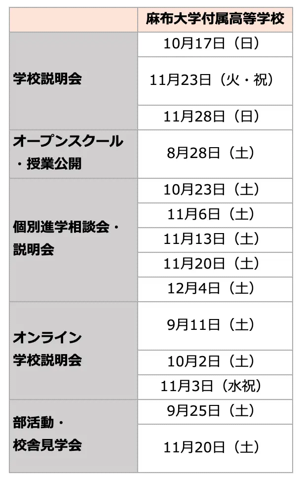 麻布大学付属のイベントは、「オープンスクール」「学校説明会」「個別進学相談会」「オンライン学校説明会」「部活動・校舎見学会」です。