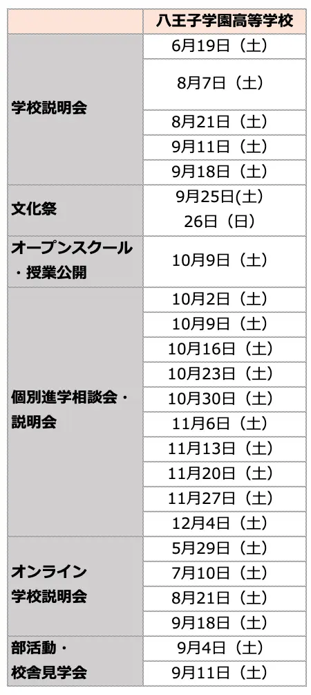 八王子学園のイベントは、「オンライン学校説明会」「学校説明会」「オンライン文理コース(特進・選抜・進学)説明会」「文理コース(特進・選抜・進学)説明会」「学校説明会in八学祭」「全学授業公開」「enjoy部活体験」です。