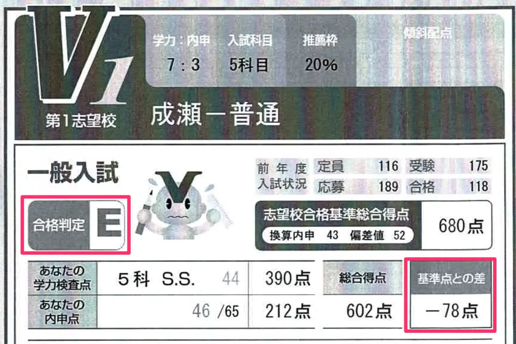これは、とある生徒の9月の模試(Vもぎ)の結果です。-78点でE判定です。
