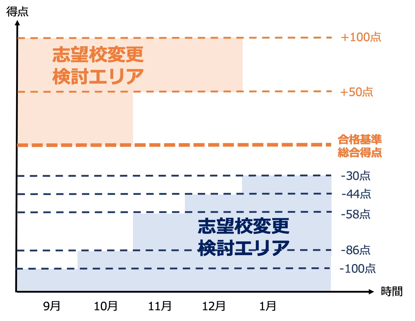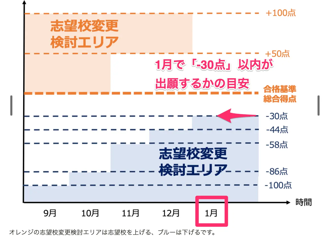 ※オレンジの志望校変更検討エリアは志望校を上げる、ブルーは下げるです。