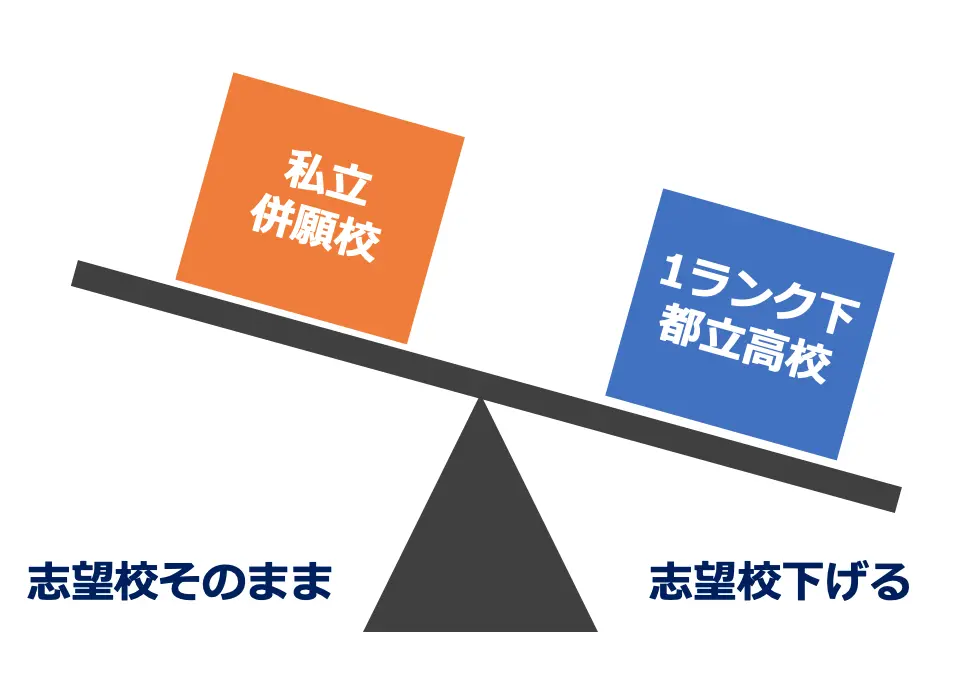 - 下げるときは「私立の併願校 VS 下げたときの都立高校」を比較