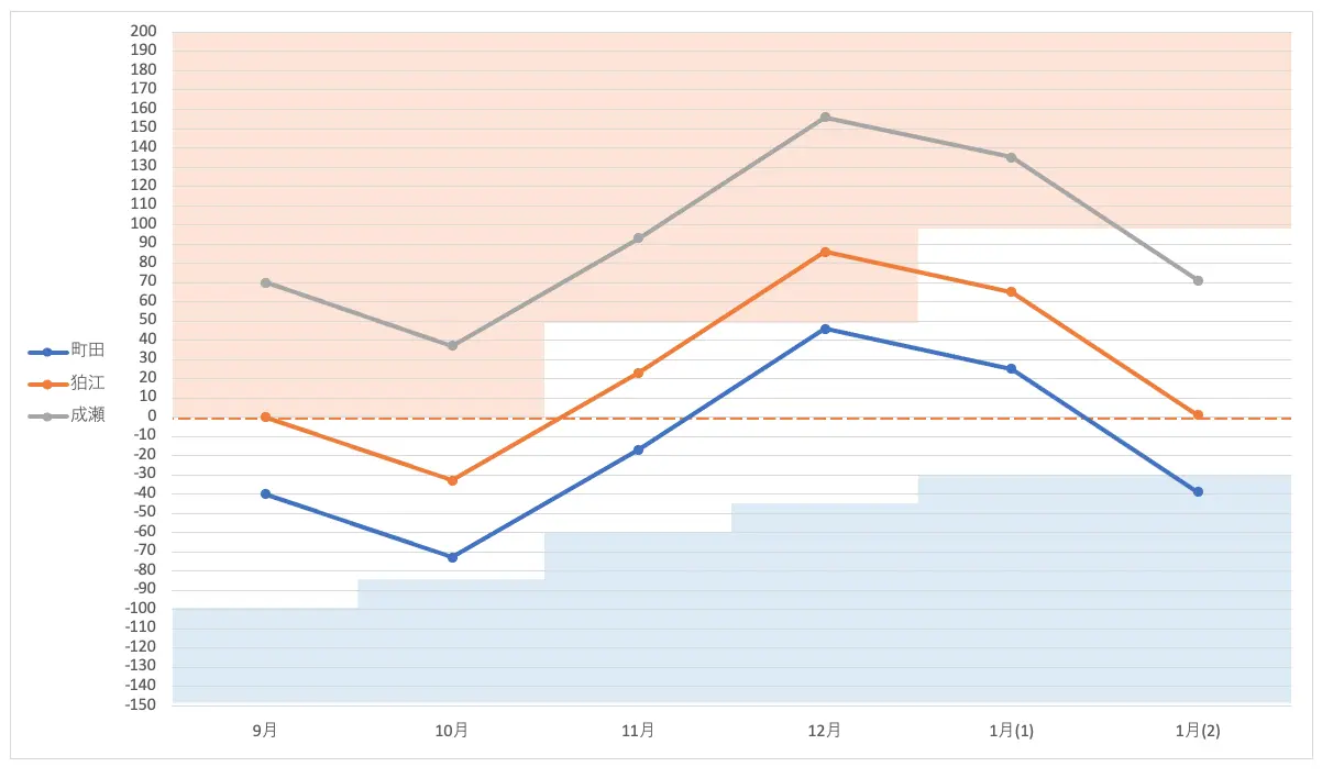もしくはすでに基準点に対してプラスの場合は、そのプラスが小さくなってしまっていないかを見ます。
