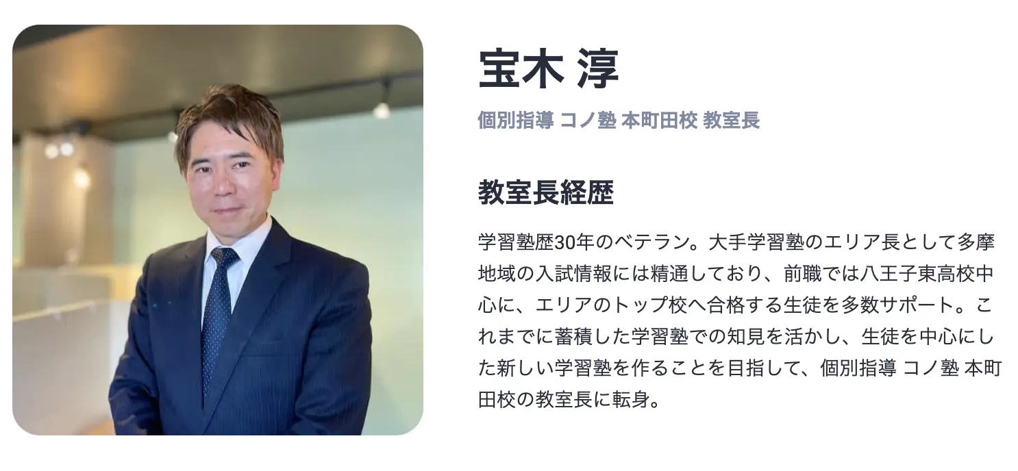 - 当日の内容:中学生活・受験にまつわる保護者のお悩みに個別指導コノ塾本町田校教室長の宝木がお答えします。