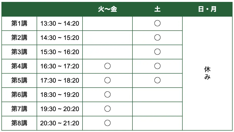 授業時間は下表の日程の中で、柔軟に組んでいただけます。