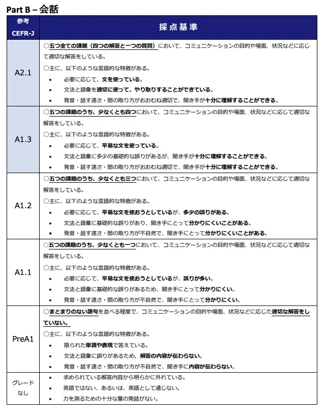 PartAで評価されるのは「音声」、つまり発音やイントネーションが評価の対象となります。それだけを聞くと「発音とか苦手だし、点数とれなさそうだな」と思うかもしれませんが、そんなことはありません。評価基準は厳しくないので、対策次第で点数がとれるようになります。