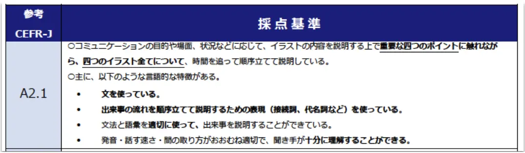 「音声」「コミュニケーションの達成度」の2つは、PartA・PartB の採点基準と比較的似ているので、ここでは「言語使用」について説明をします。具体的な例として、PartC の A2.1 の採点基準を見てみましょう。