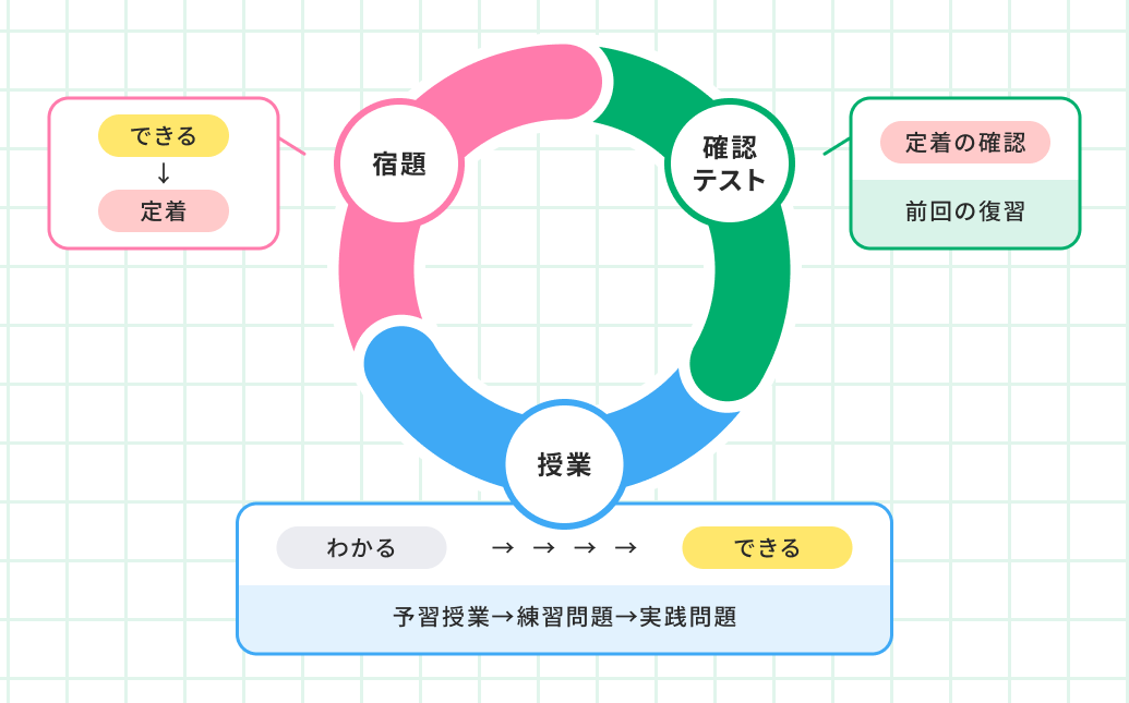 生徒一人ひとりの学習や成績のデータをもとに計画を立て、個人の課題を着実に解決するカリキュラムを提供します。塾・宿題・学校で何度も同じ問題に取り組むことで、記憶が定着しやすく、学習の成果が最大化されます。