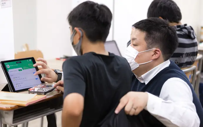 「わかりやすさ」にこだわったデジタル教材。そこから得られた学習データを教室長が生徒の指導に役立てるため、指導の質が格段に上がります。