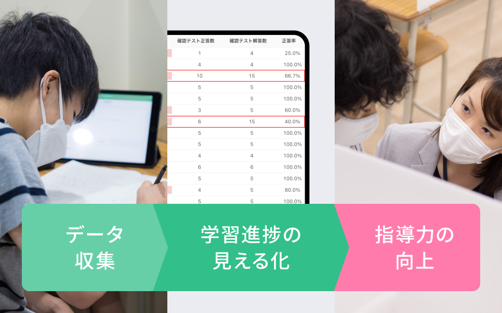 デジタル教材で学習データを収集。学習進捗や得意・苦手が見える化されており、教室長が生徒の指導に役立てるため、指導の質が格段に上がります。